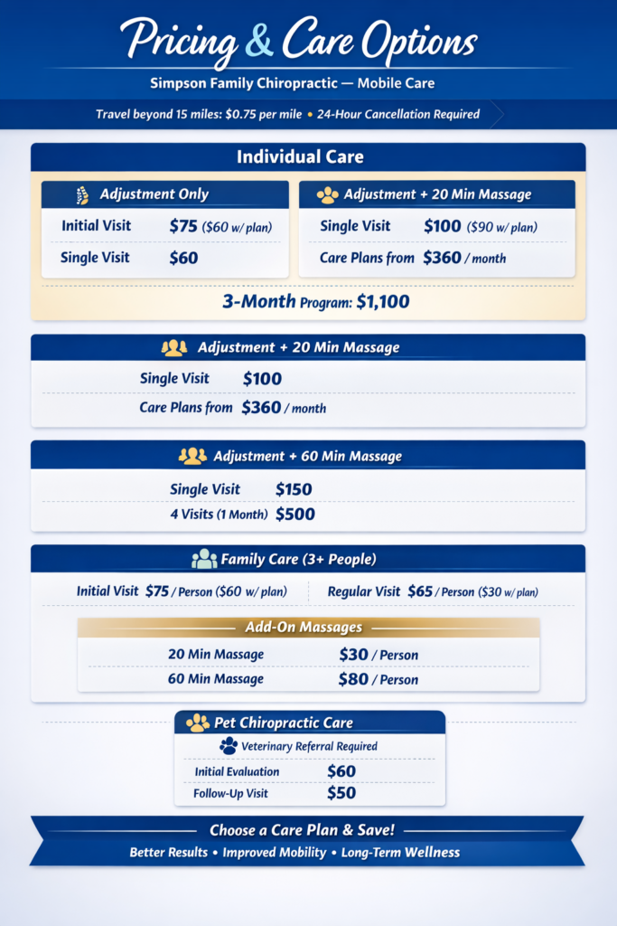 Our mission is to help families move better and feel their best through evidence-based chiropractic treatment and rehabilitation. Whether you’re recovering from an injury, managing chronic pain, or seeking preventative care, we provide comprehensive services tailored to your individual needs. By bringing our clinic to you, we eliminate travel barriers and create a comfortable healing environment where your whole family can receive the care they deserve.